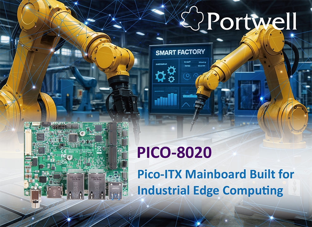 Nieuw Vennep, Netherlands – November 27, 2025- Portwell announces the PICO-8020, a compact Pico-ITX embedded board measuring 100mm x 72mm. Designed for space-constrained industrial environments, the board integrates either the Intel® Processor N150 or Intel Atom® x7000RE series (x7433RE or x7211RE), offering power-efficient performance alongside essential I/O, onboard security features, and extended temperature support (select SKUs). The PICO-8020 is well-suited for applications such as automation systems and medical devices, where edge computing, real-time control, and compact form factors are increasingly required, with growing adoption of vision-based automation and diagnostics.